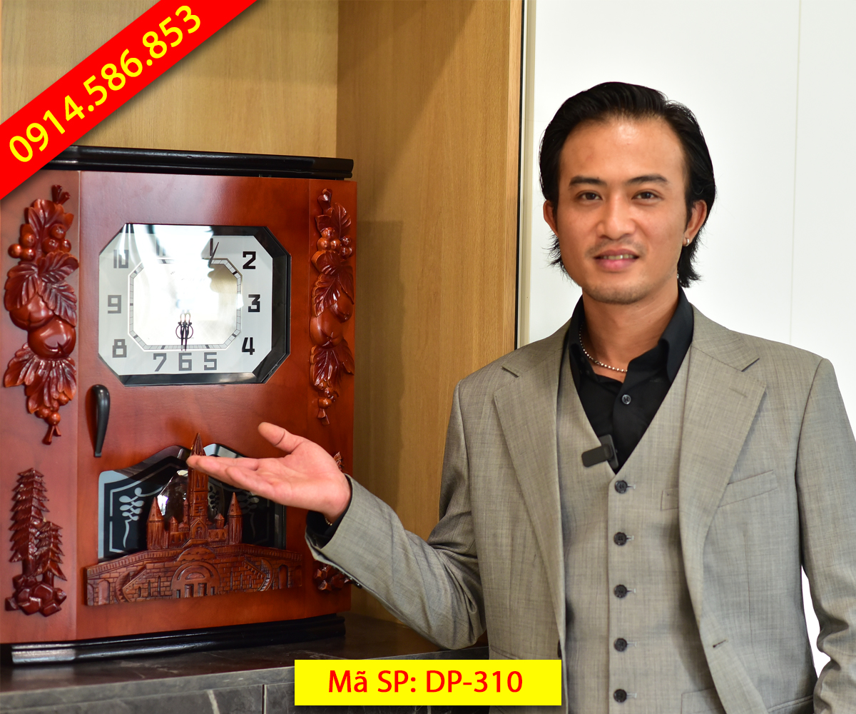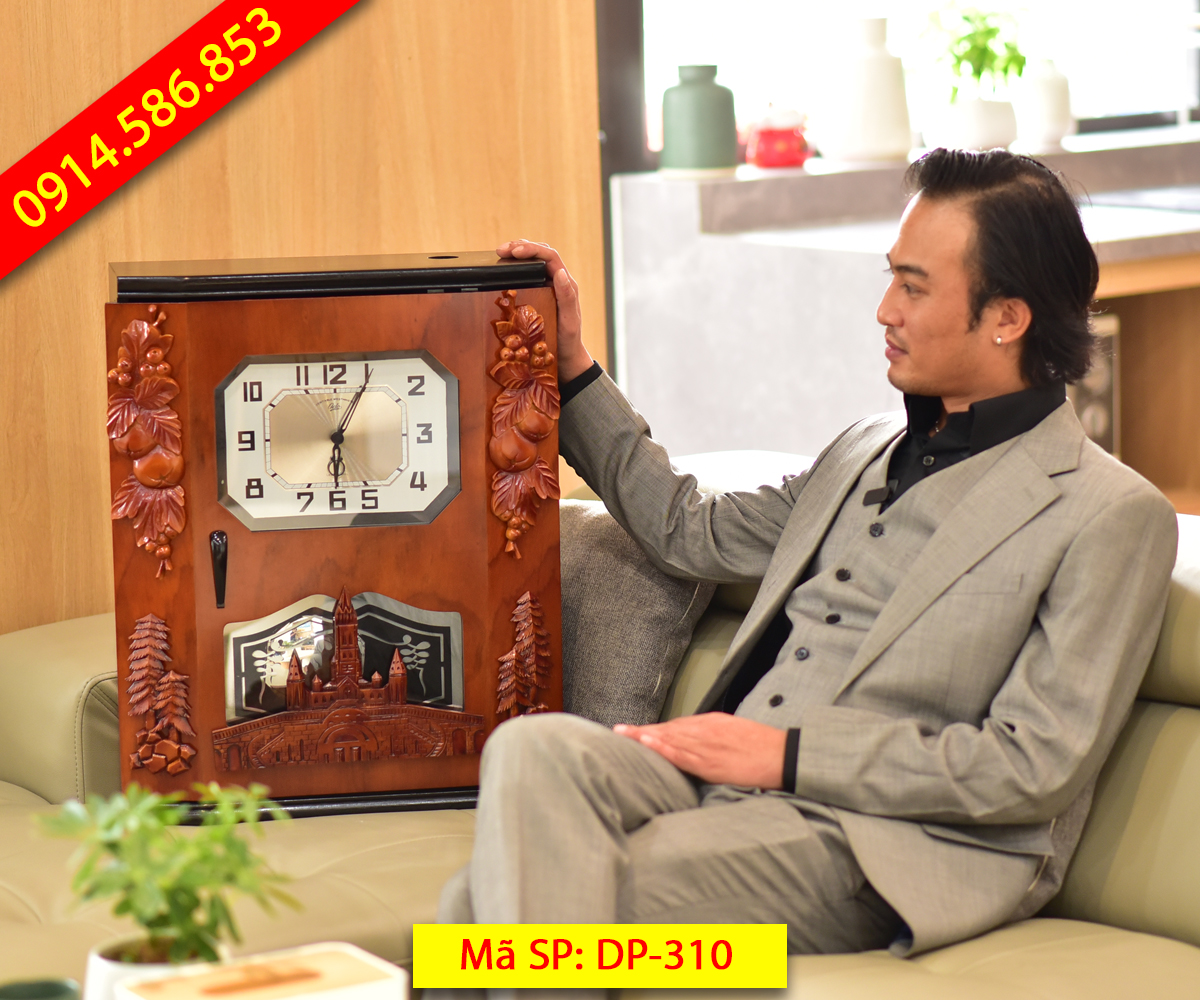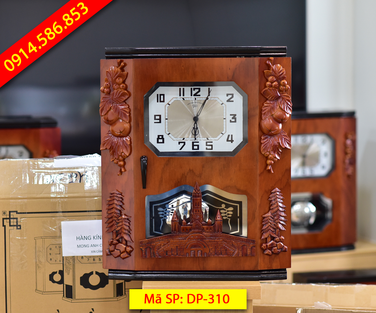 Đồng hồ thùng bè dáng cổ DP-310 là phiên bản đặc biệt nhất bởi đây là mẫu có thiết kế cầu kỳ, nhiều họa tiết trang trí nhất với họa tiết 4 góc kết hợp chùm nho, cành quả hồng và cây thông. Nổi bật nhất là họa tiết nhà thờ gắn dưới bao phủ cả ô quả lắc tạo nên sự khác biệt hoàn toàn so với các mẫu trước đây. Đây cũng là mẫu nhận được sự quan tâm đặt hàng nhiều nhất.