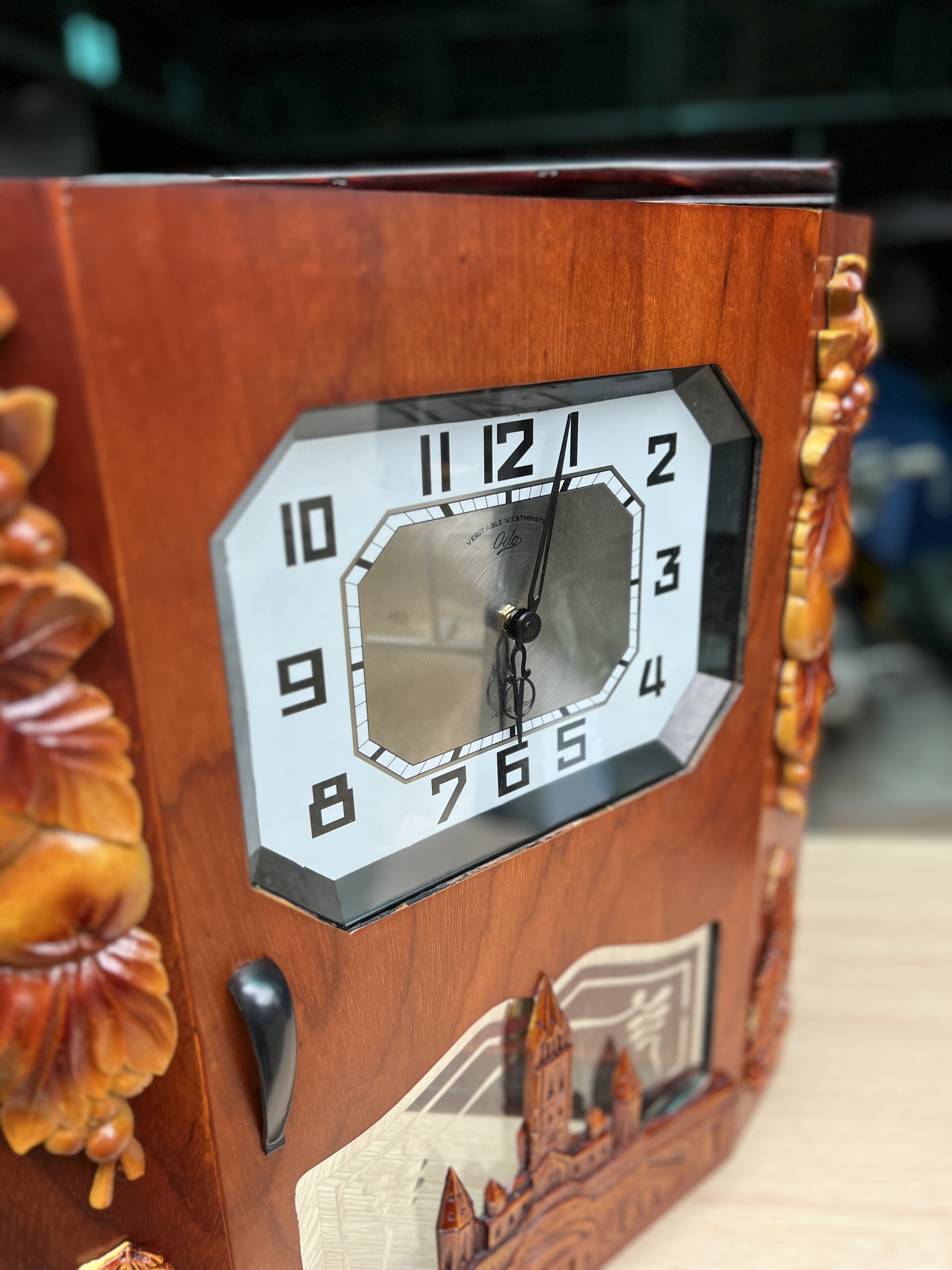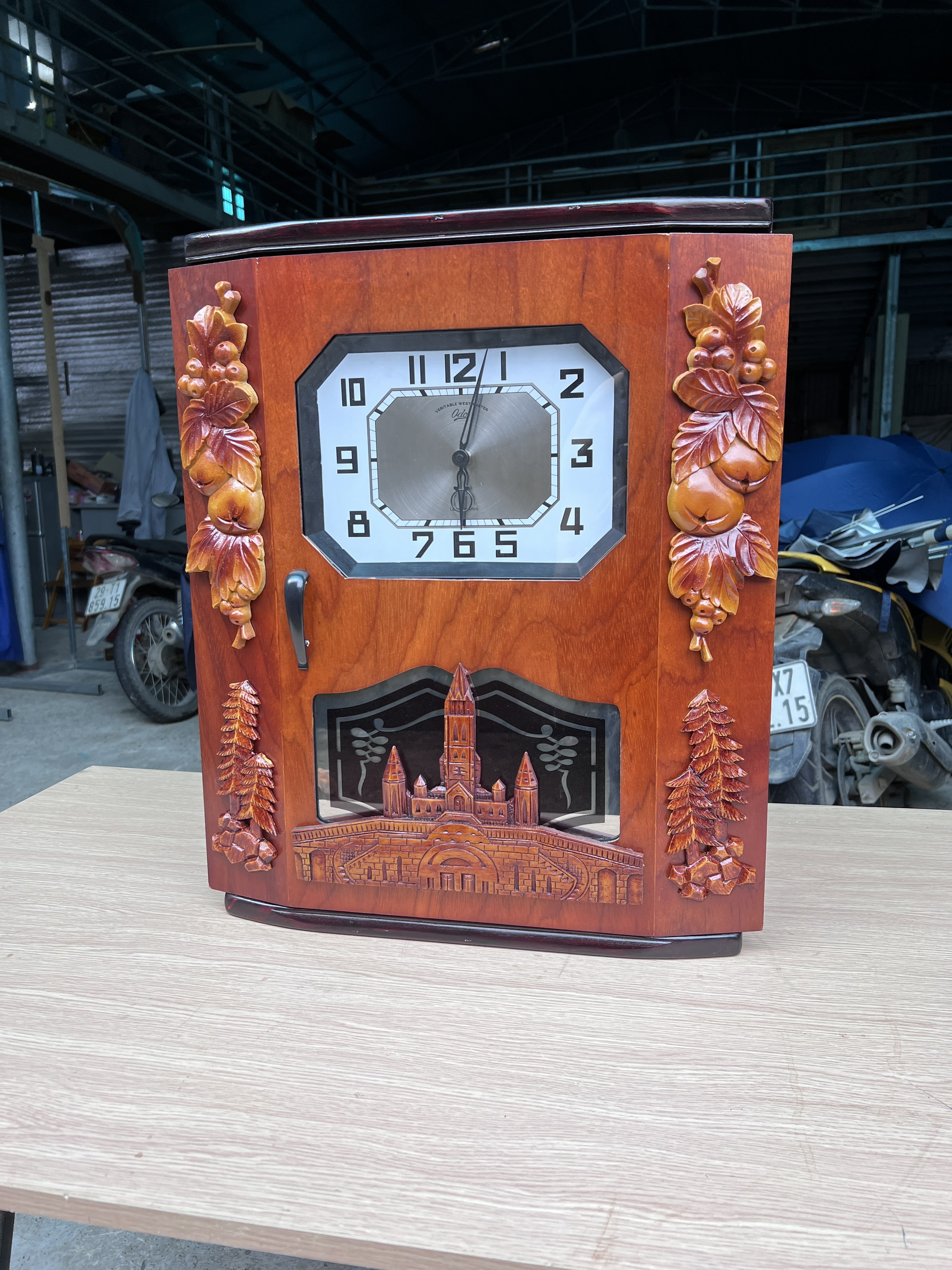 Thùng đồng hồ:được làm từ gỗ dổi cao cấp dát mỏng, xử lý keo chuyên dụng chống cong vênh mối mọt, được xưởng lựa chọn vân gỗ qua nhiều công đoạn để chọn được vân gỗ đẹp nhất, Tuổi thọ đã được kiểm chứng từ khách hàng sử dụng trên 8 năm thùng chưa có hiện tượng nứt, mối, mọt