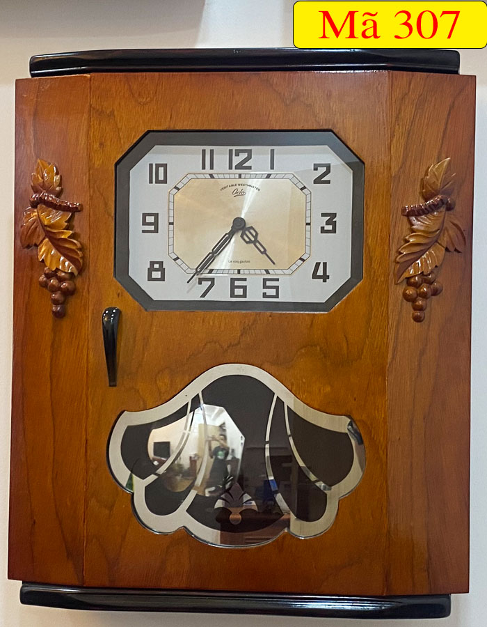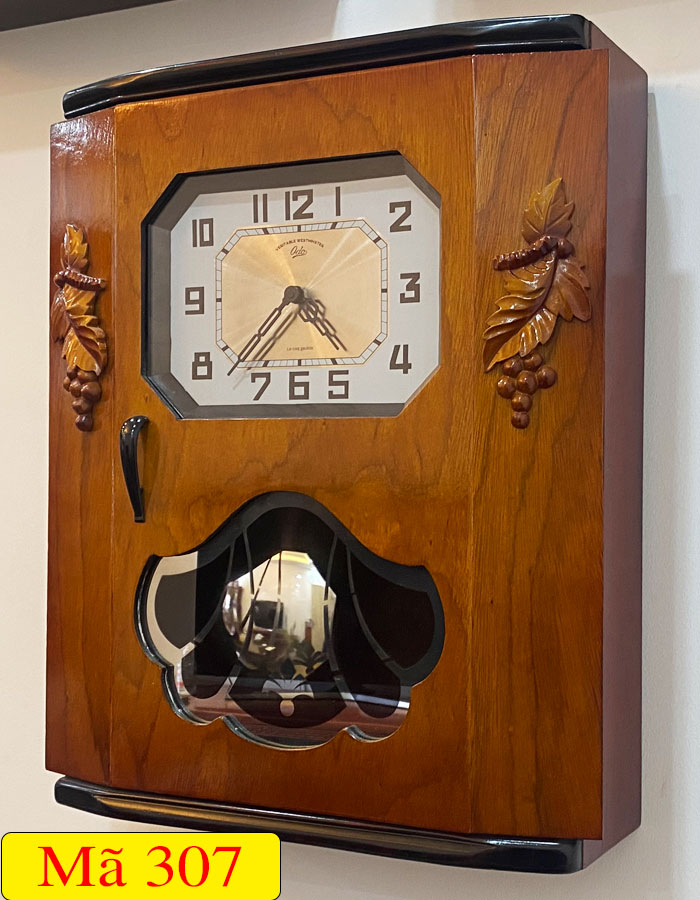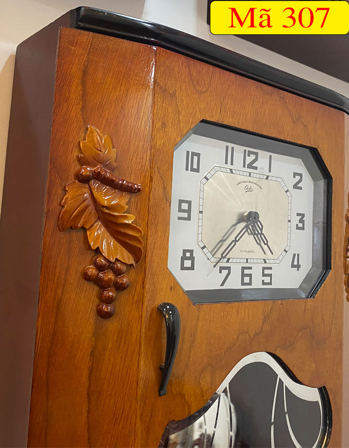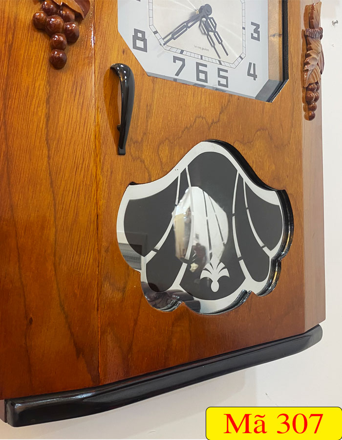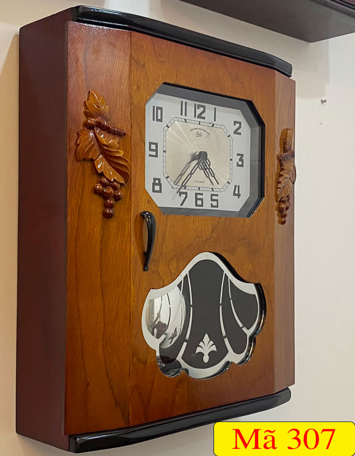 Mẫu đồng hồ treo tường thùng bè dáng cổ DP-307 được thiết kế theo kiểu dáng thùng bè dáng cổ của Pháp và được trang trí thêm họa tiết chùm nho đối xứng mang ý nghĩa về sự sum vầy, sung túc, thể hiện ước mong của con người về một cuộc sống hạnh phúc và no ấm quanh năm. Ngoài ra, mặt kính quả lắc được trang trí theo hoạt tiết lá rẻ quạt được xem là biểu tượng của sự quật cường, sức sống tươi tốt mãnh liệt, sự trù phú, ấm no cho gia đình.